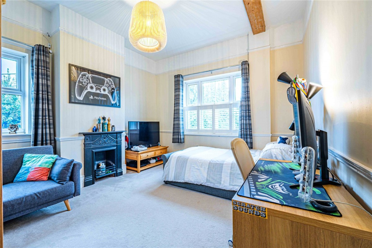 The dual-aspect dining room enjoys natural light from both front and side windows, with a charming fireplace and inset stove. The 20ft living room, also with a fireplace and cast-iron stove, connects seamlessly through double doors to a superb family room, extending nearly 27ft and opening directly onto the garden.