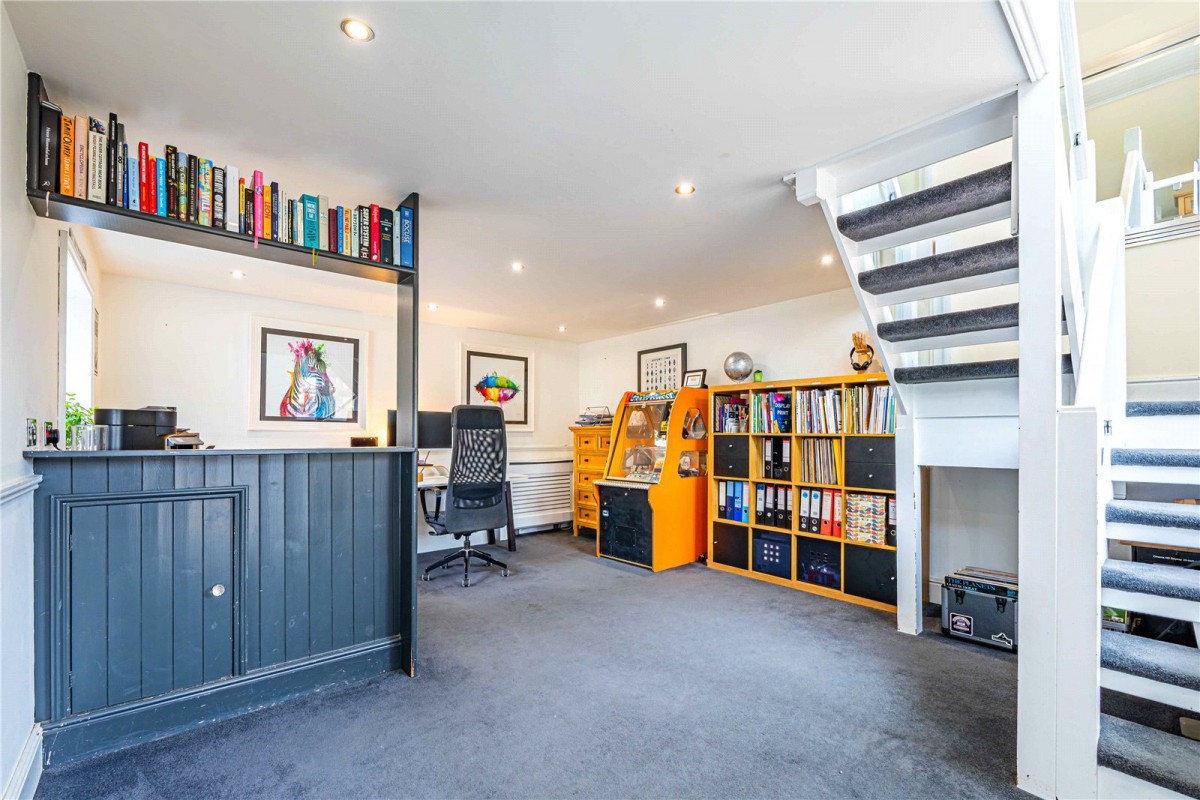 The dual-aspect kitchen is fitted with a range of base and eye-level units, offering practicality alongside character. Completing the ground floor is a dedicated study, ideal for remote working.