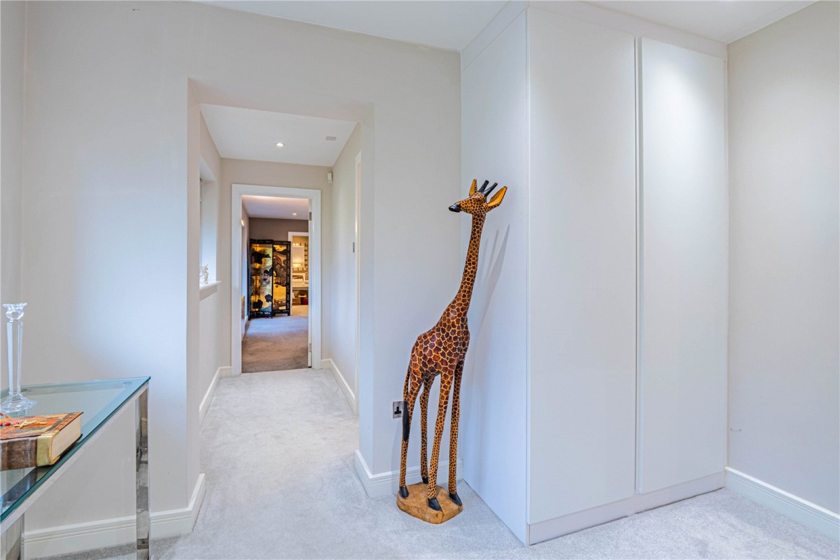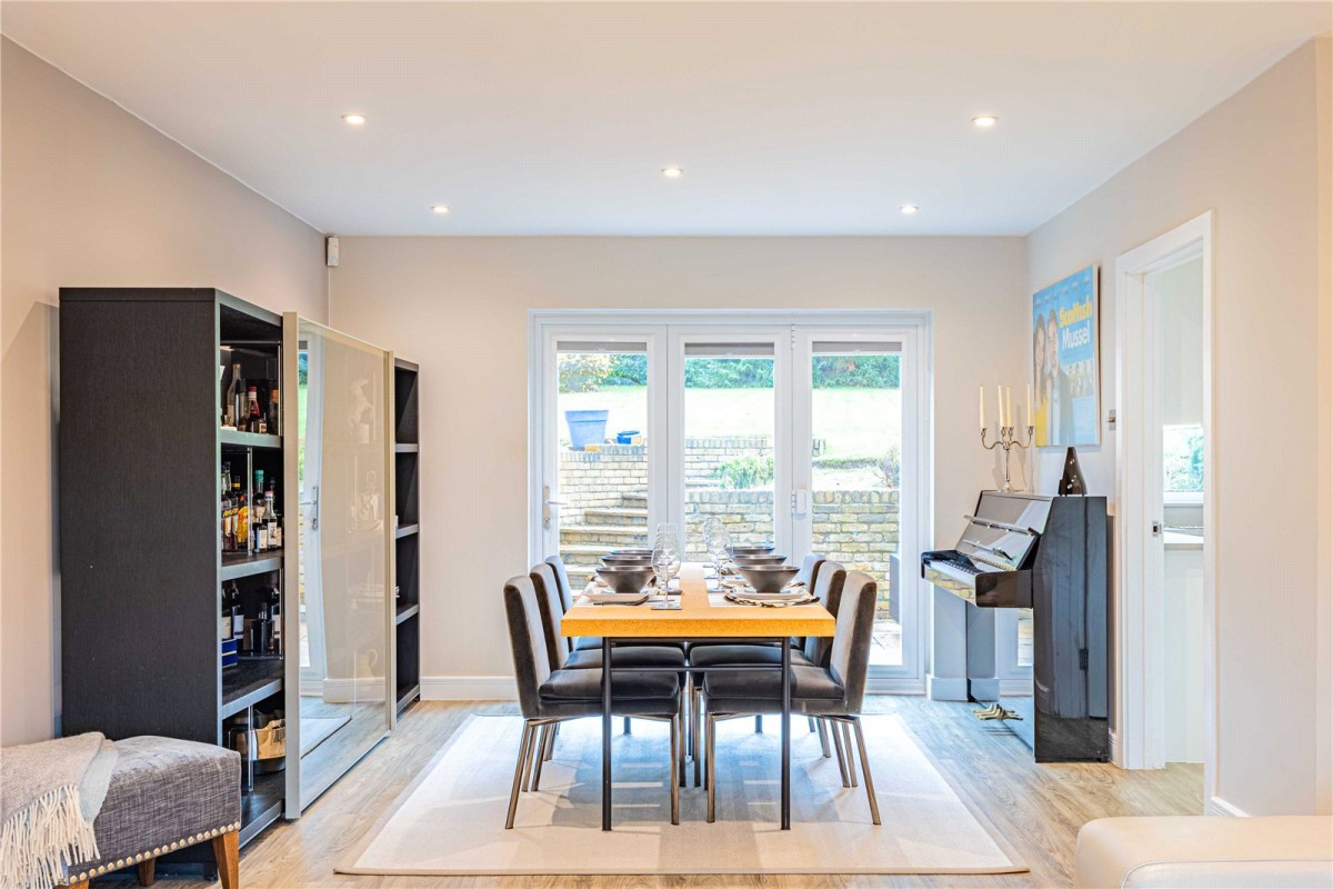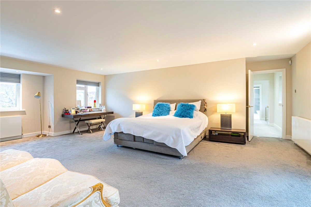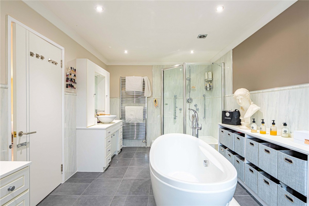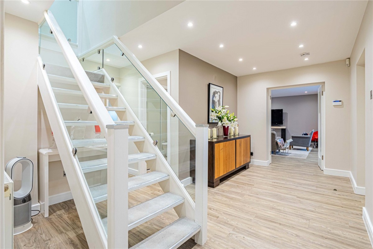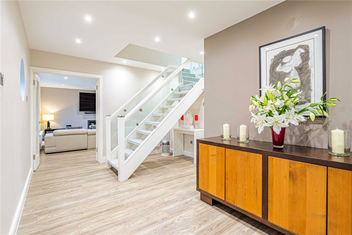To the first floor, the principal bedroom enjoys an en suite bathroom, a dressing room, and access to a private roof terrace overlooking the garden. Two additional bedrooms benefit from en suite shower rooms, while three further bedrooms are served by a well appointed family bathroom.