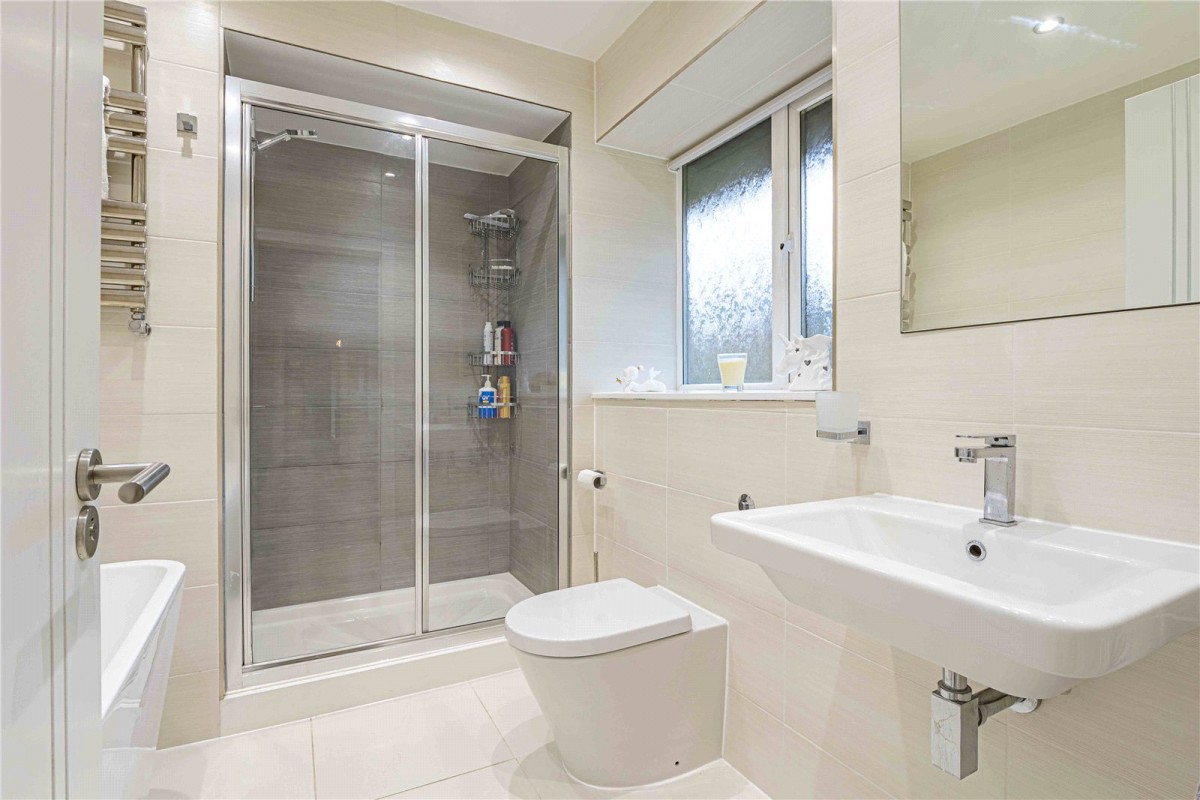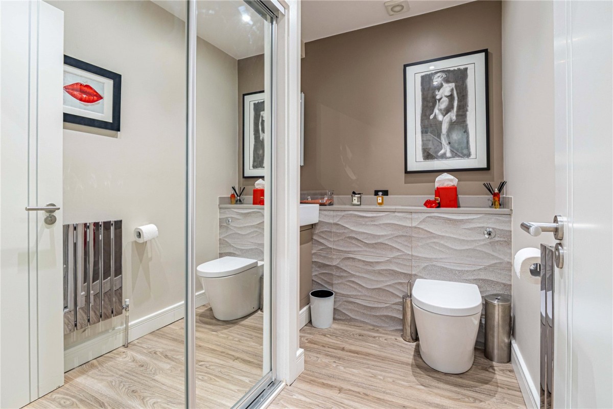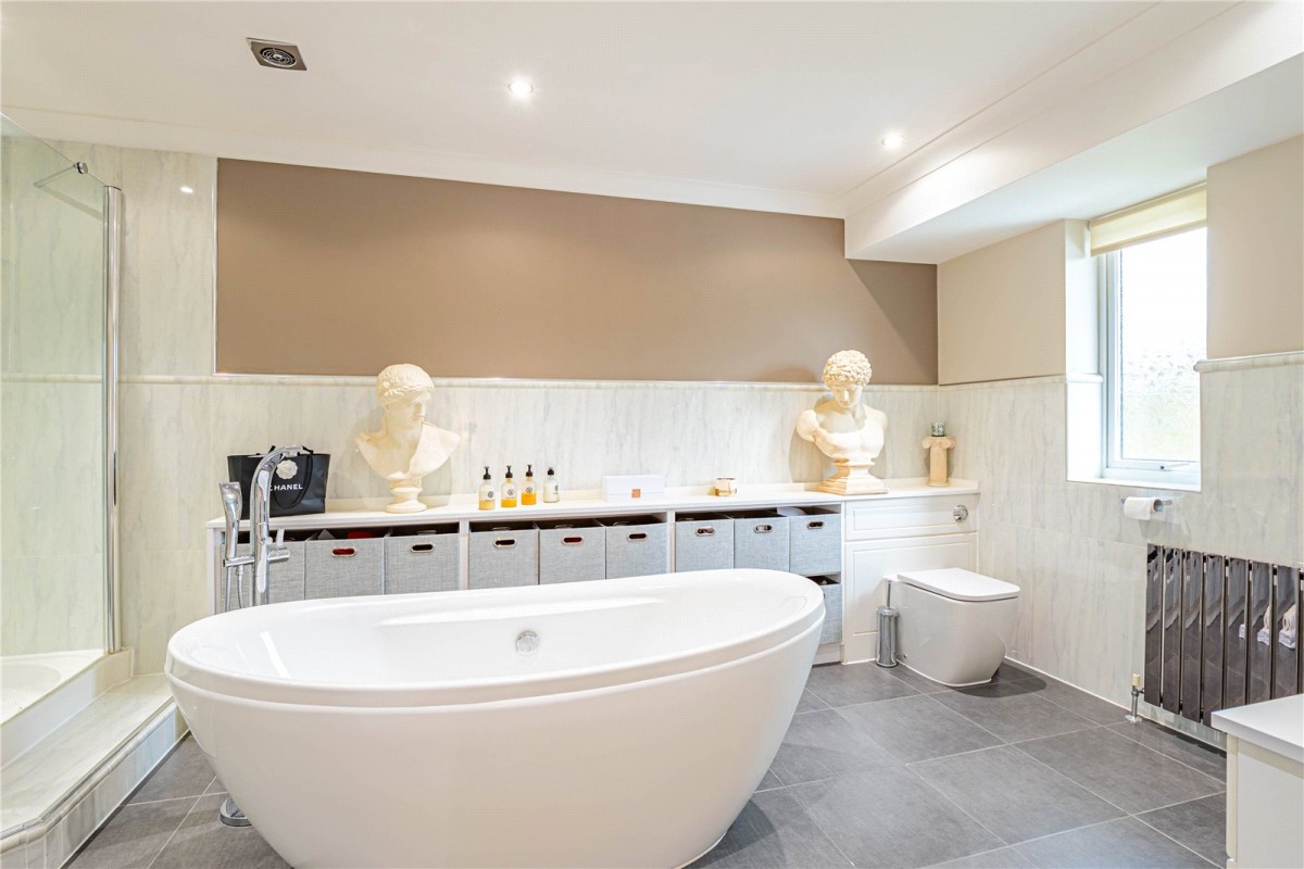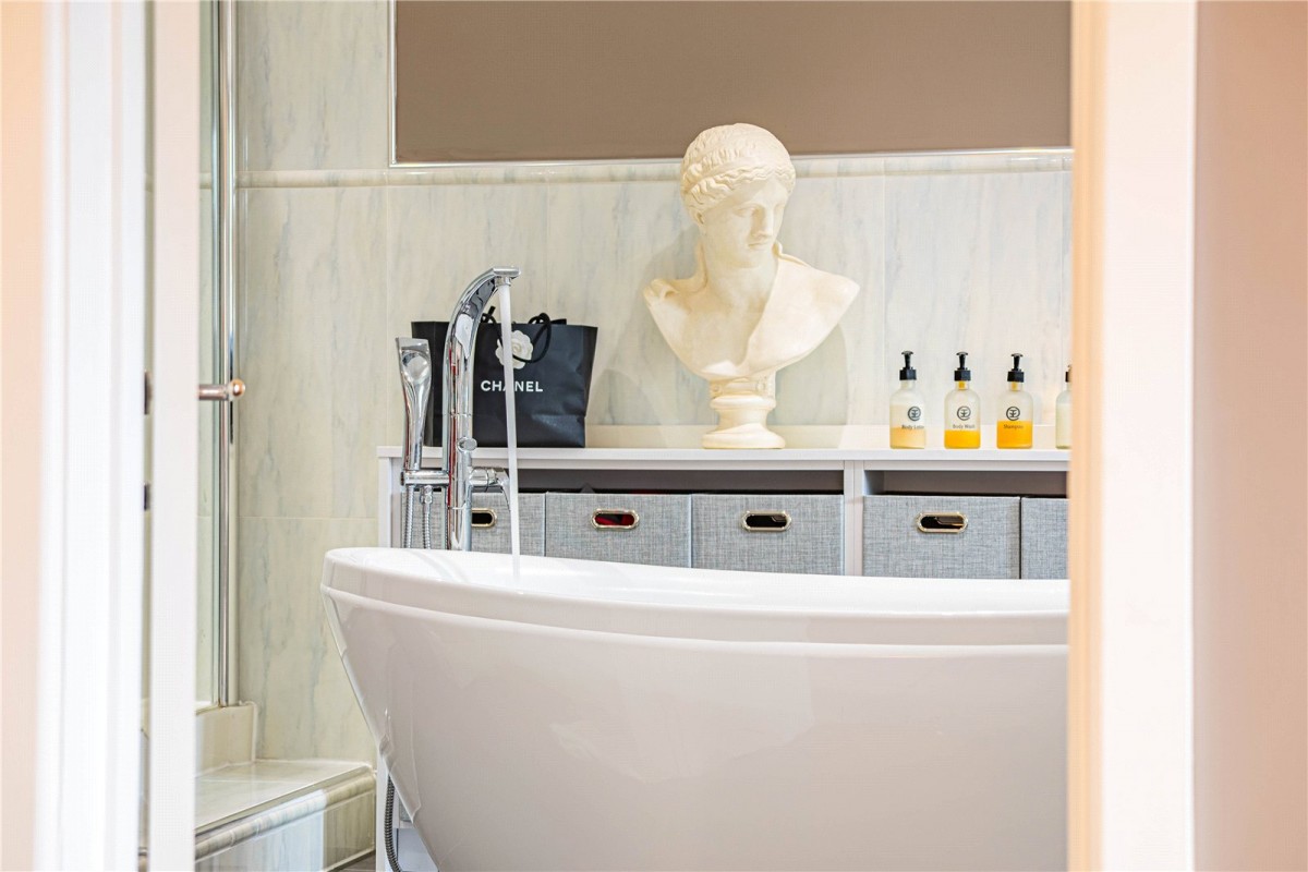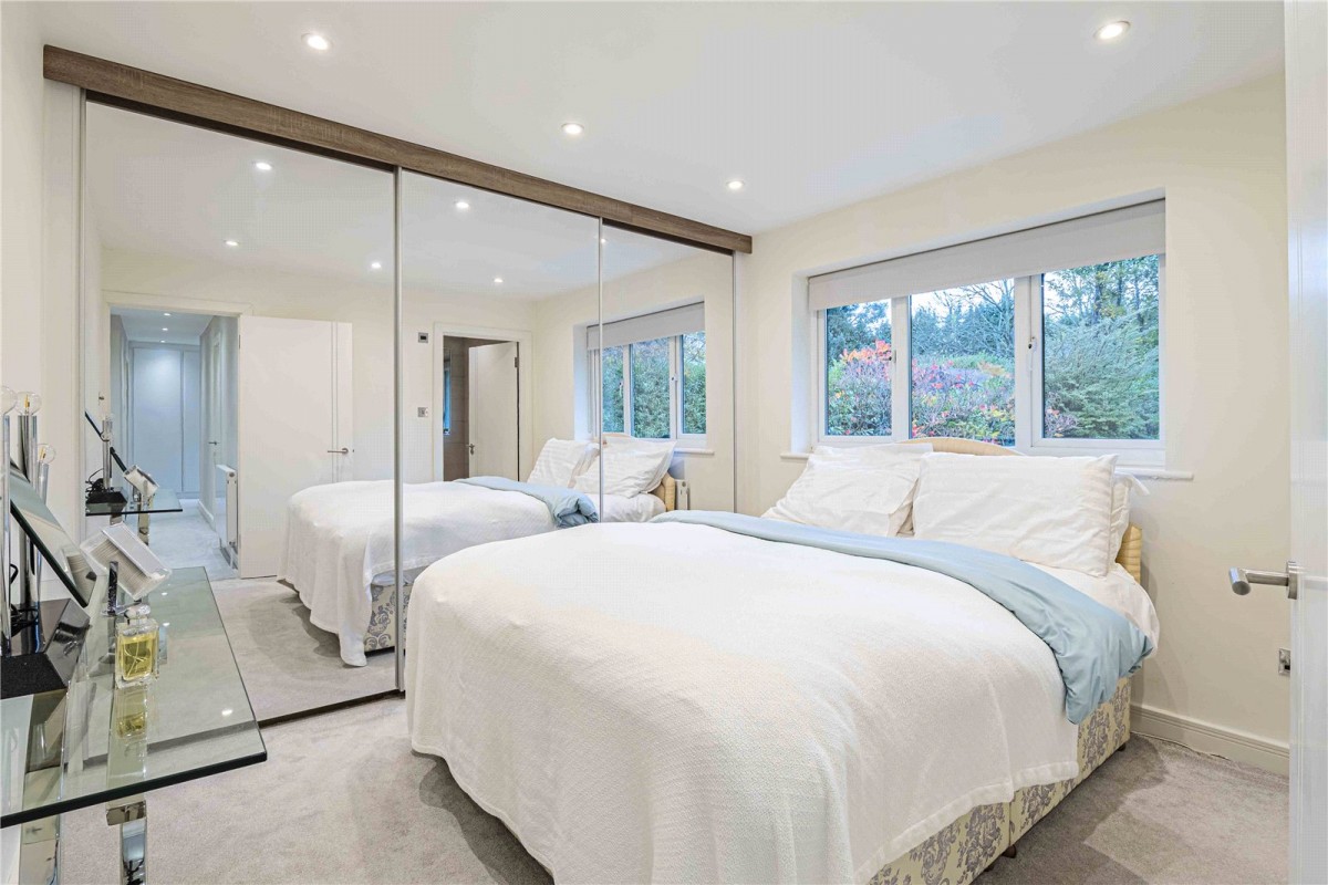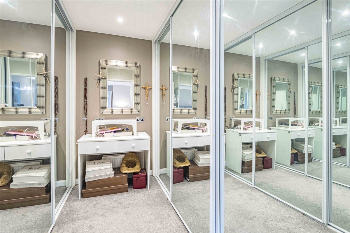 To the first floor, the principal bedroom enjoys an en suite bathroom, a dressing room, and access to a private roof terrace overlooking the garden. Two additional bedrooms benefit from en suite shower rooms, while three further bedrooms are served by a well appointed family bathroom.