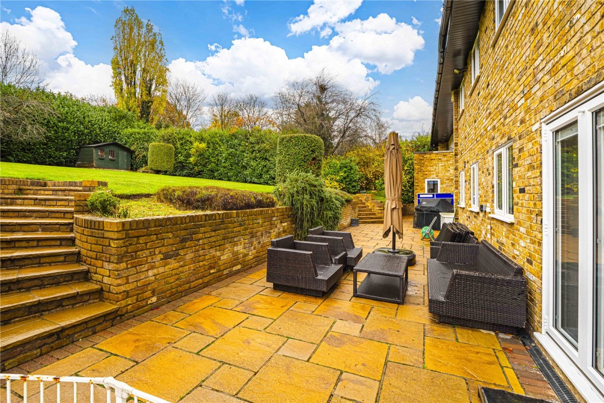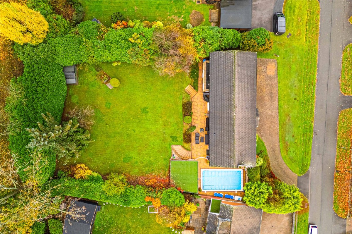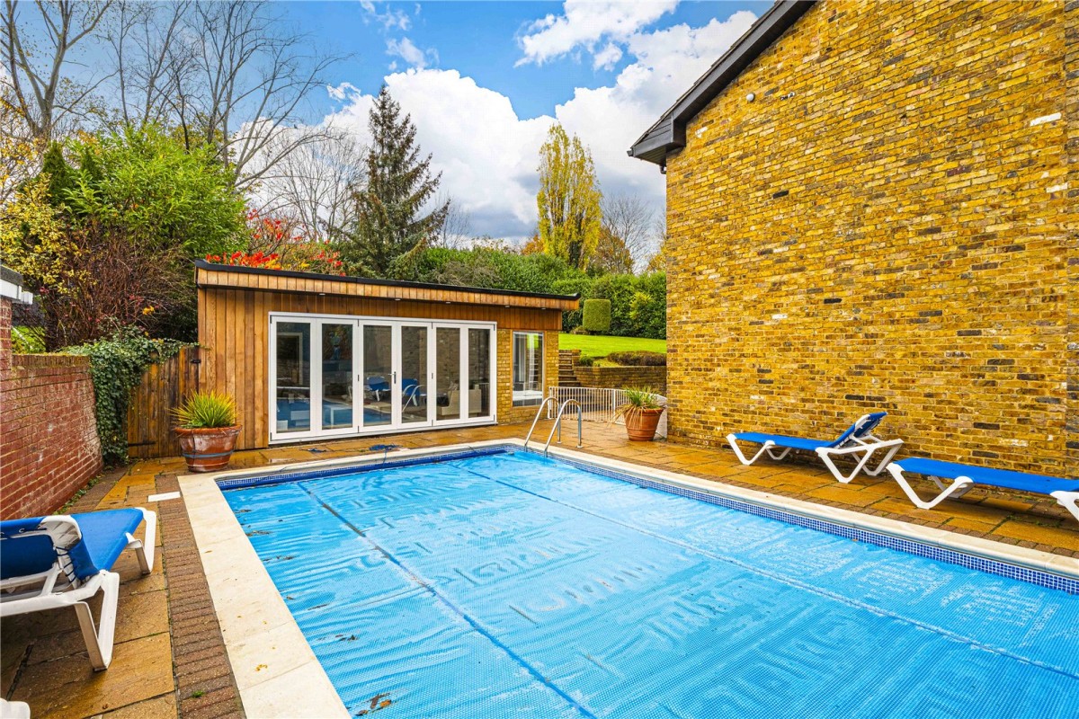 The mature rear garden offers a high degree of privacy and features a heated swimming pool and paved terrace, providing an excellent setting for outdoor entertaining. A well-equipped pool house includes a sauna, pool room, and storage, while a separate shower room near the garage adds further convenience.