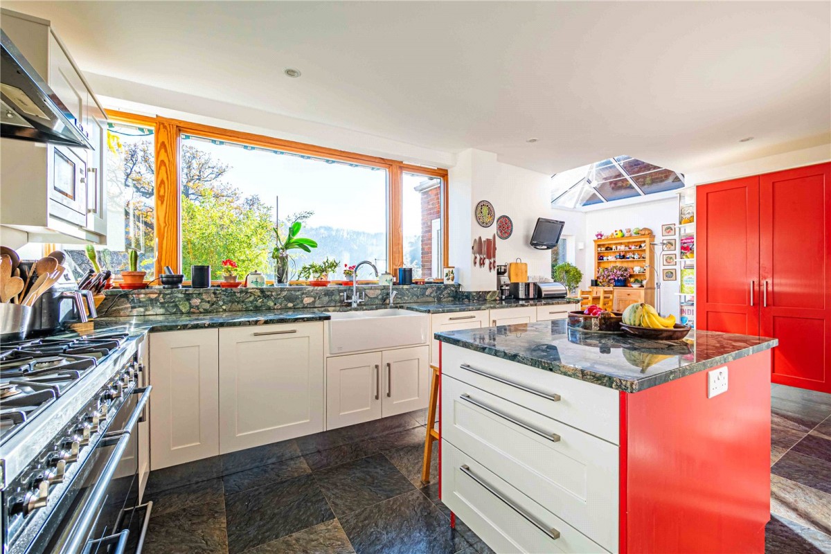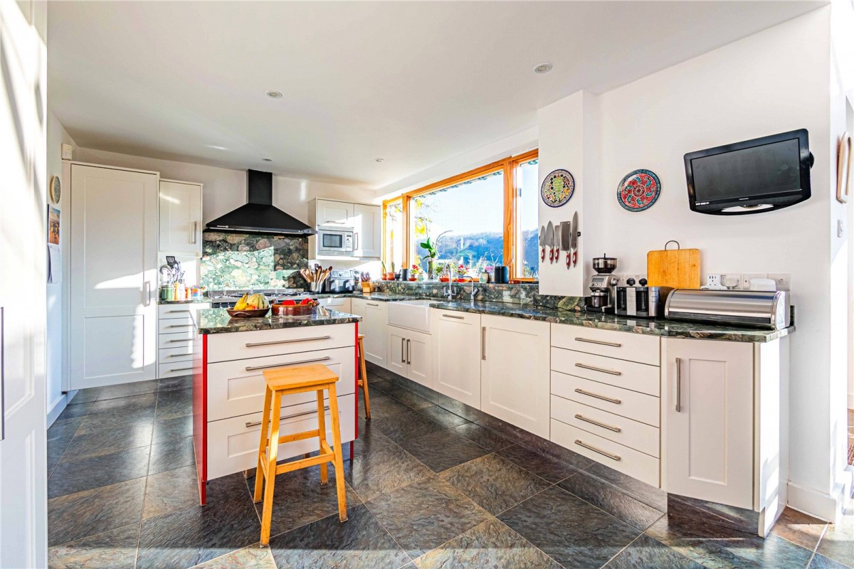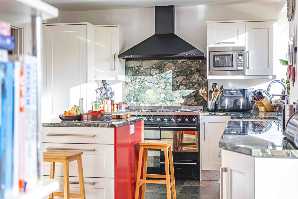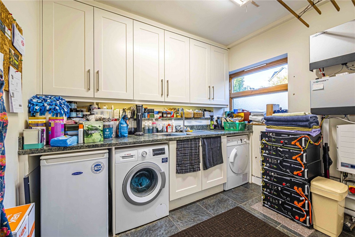 At the heart of the home is a striking open-plan kitchen, complete with extensive work surfaces, pantry storage, a generous dining area and a separate breakfast space. Natural light fills the room, giving it a warm and sociable feel, while a conveniently located utility room and downstairs WC add further practicality.