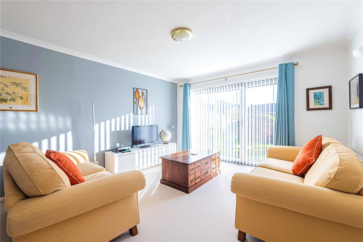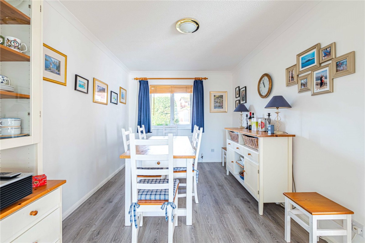 The dining room, positioned at the rear, enjoys direct access to the kitchen, offering flexibility for both formal dining and casual family meals. The kitchen itself is fitted with modern units and ample work surfaces, and benefits from a door leading directly into the garden, making it well suited for summer dining and family gatherings.