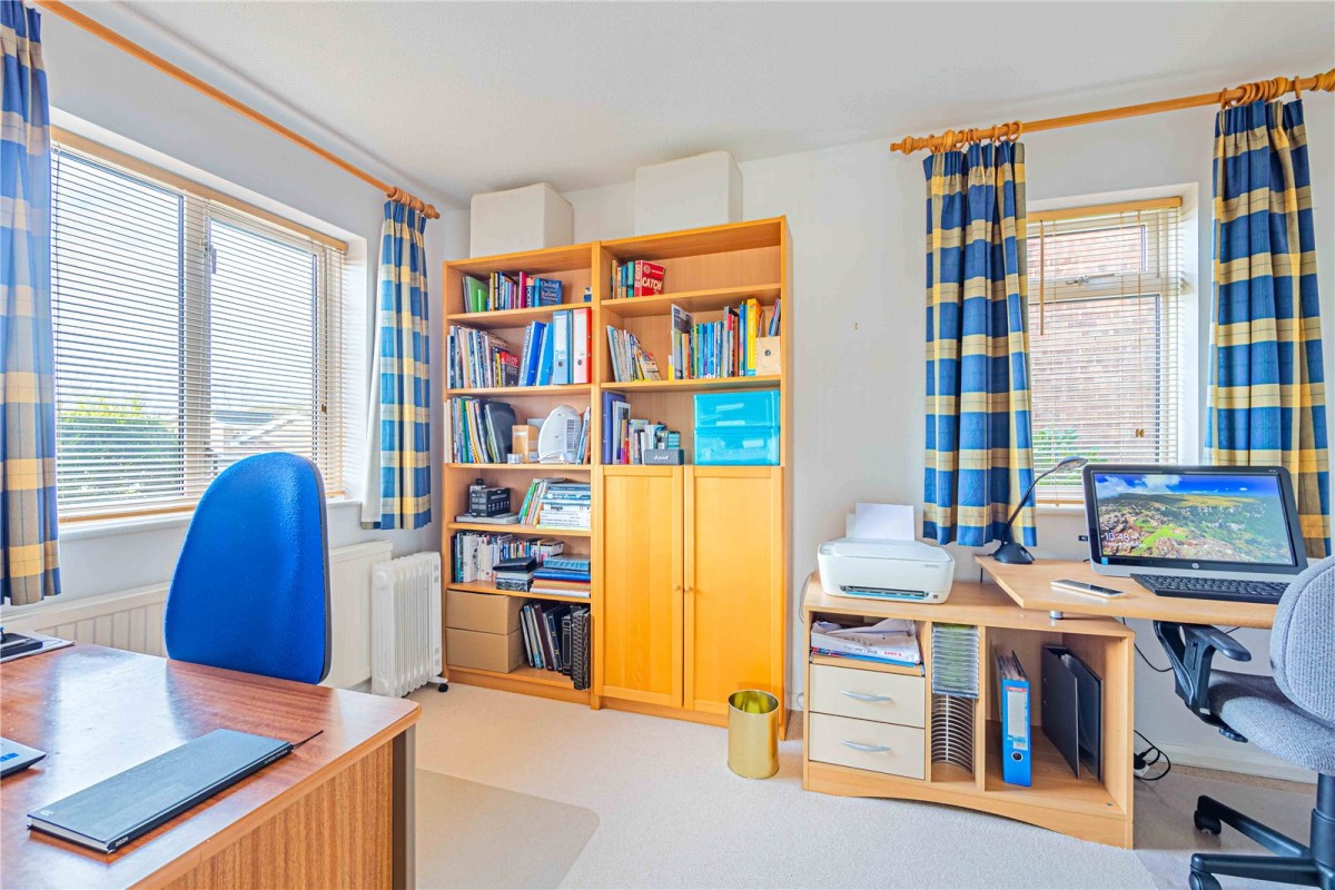 Upstairs, the first floor provides four well-proportioned bedrooms. The principal bedroom is particularly impressive, with a stylish en-suite bathroom and fitted wardrobes, creating a calm and private retreat. The second and third bedrooms are both generous doubles, while the fourth bedroom is perfectly suited as a child’s room, guest space or second study. A family bathroom, finished with a contemporary suite, completes the accommodation on this floor.