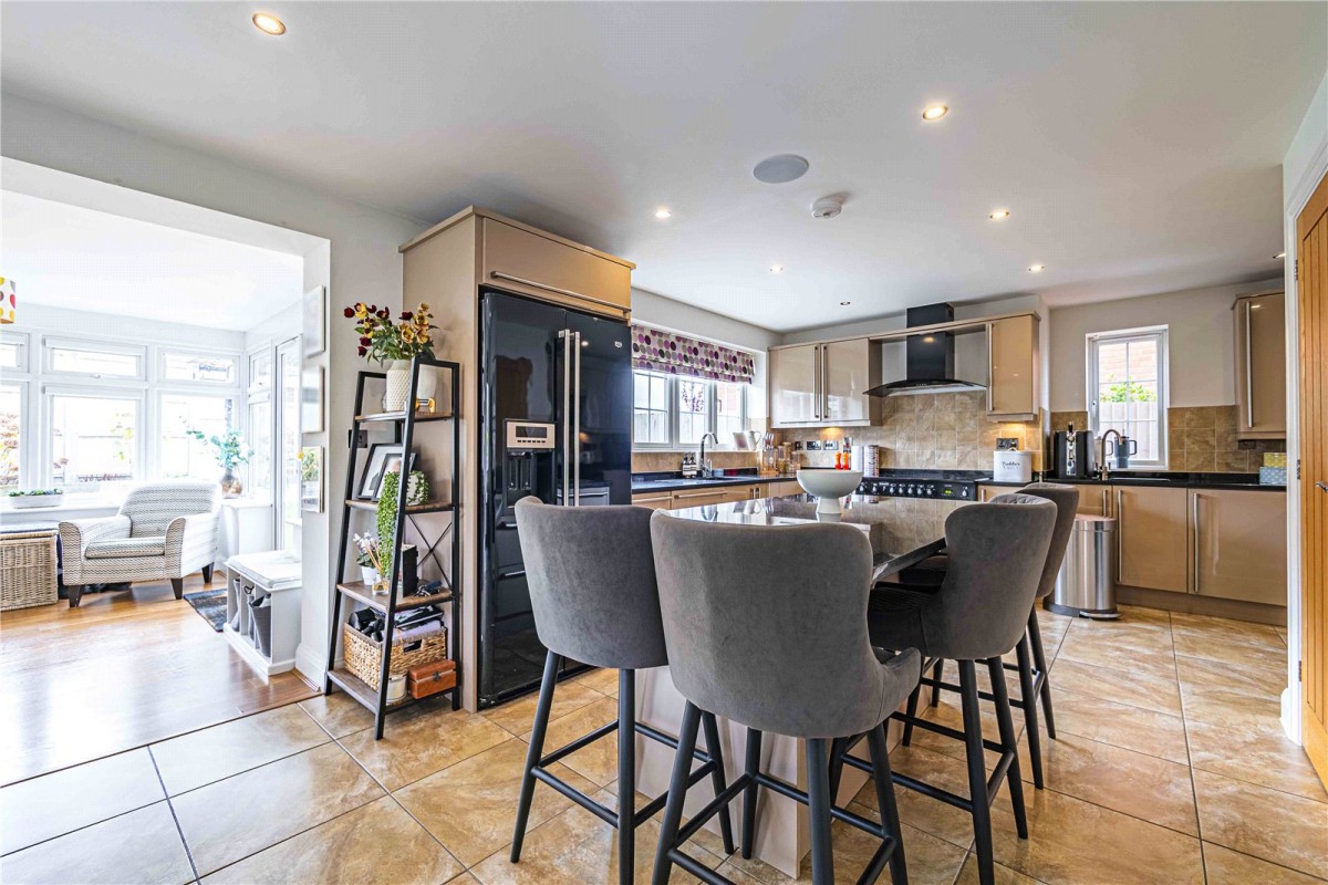At the heart of the home lies a spectacular kitchen and breakfast area, complete with sleek GRANITE worktops, a central island, and high end modern units, ideal for those who love to cook and entertain. The open plan design flows beautifully into a spacious dining area and a bright sun room at the rear, where double doors lead out onto the rear garden, south-facing patio.