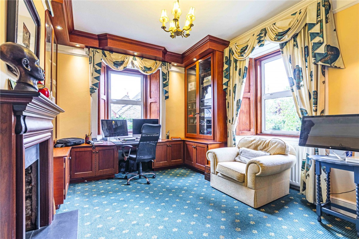 The ground floor flows with an array of five reception rooms, each with its own personality. Whether it’s the light-filled drawing room (with its secret cinema set-up), the cosy library, or the family room opening to the gardens, there’s a space for every mood. The heart of the home beats in the traditional farmhouse kitchen, complete with an oil-fired Aga and views over the gardens.