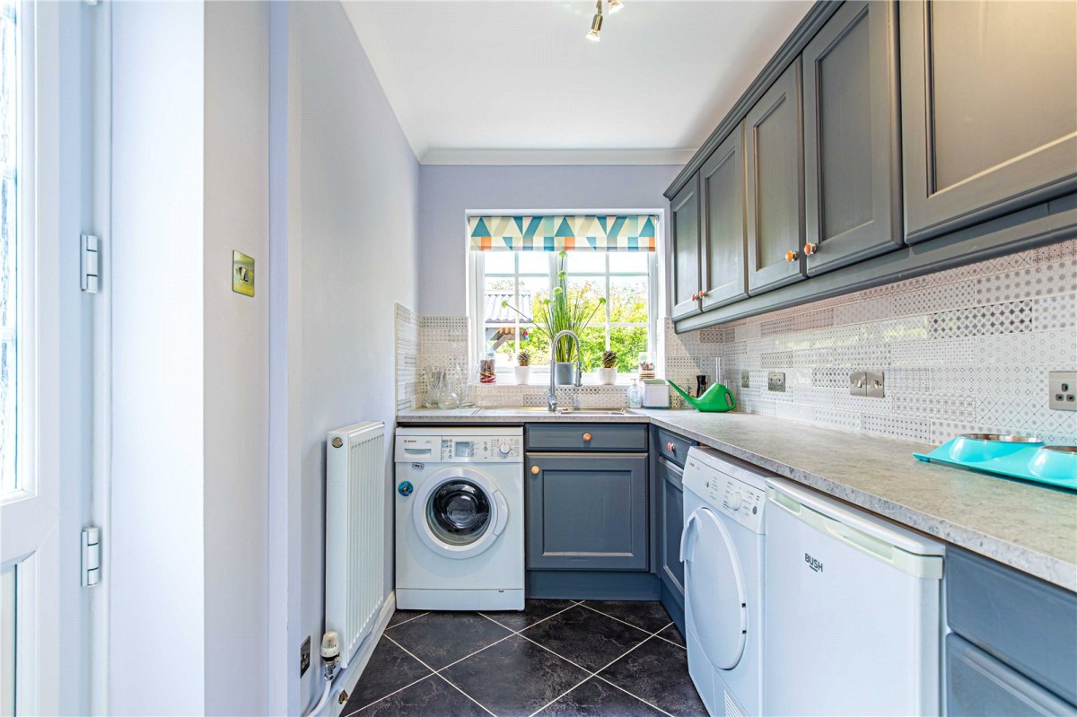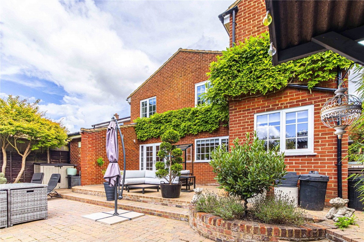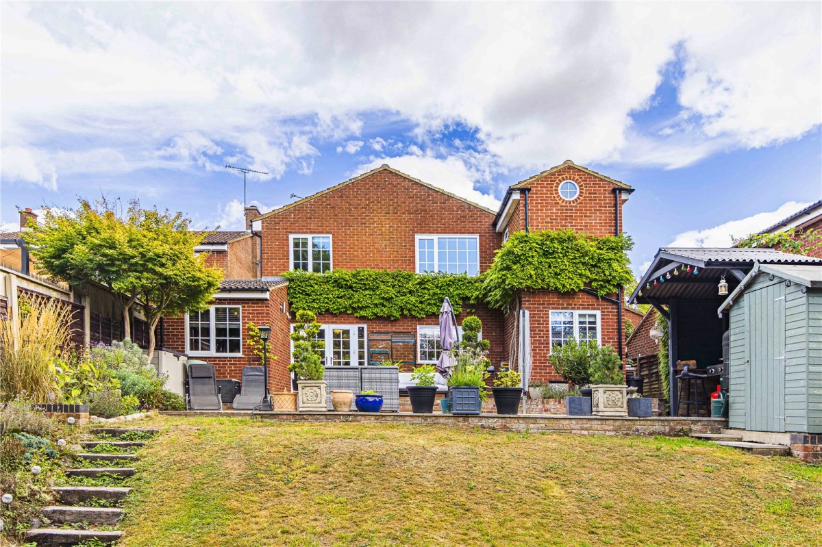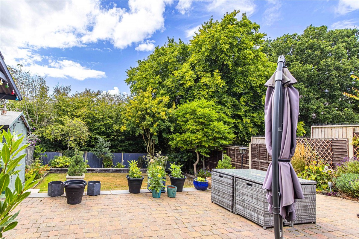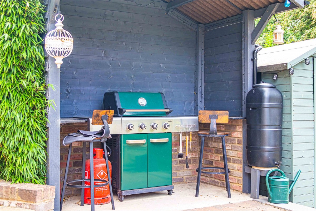 The outside space is every bit as appealing as the interior. The rear garden offers a high degree of privacy and has been thoughtfully landscaped to create distinct areas for relaxation and entertaining. A generous patio terrace is perfect for alfresco dining, with a covered BBQ area providing year round usability. To one side, a timber storage shed offers practical storage, while the remainder of the garden is laid to lawn, edged by mature planting for colour and texture throughout the seasons.