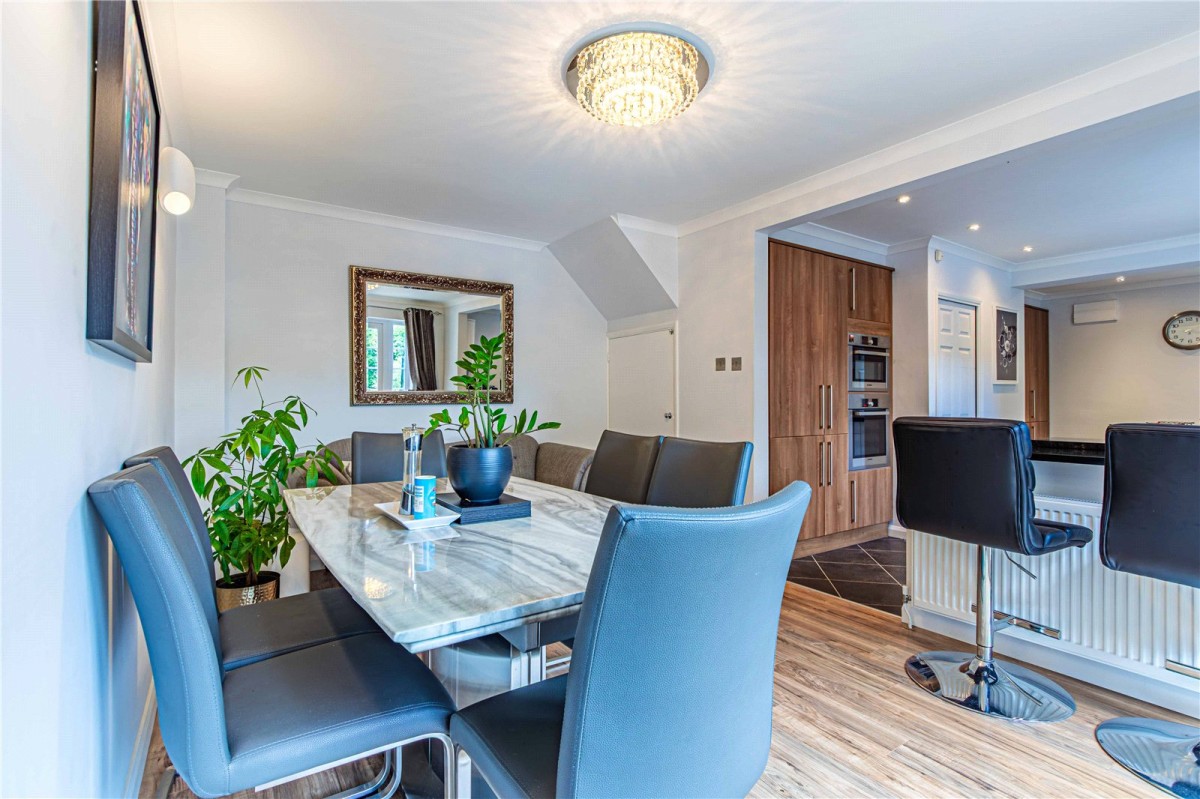 The entrance hall flows effortlessly into a large, inviting living room, where a charming log burner creates a warm focal point for cosy evenings. Expansive windows frame delightful views over the front garden, filling the room with natural light. To the rear, the heart of the home unfolds, a sleek and stylish modern kitchen seamlessly connecting to a dining area. Here, French doors open directly onto the garden, encouraging indoor/outdoor living. The REFITTED kitchen is superbly appointed with a wide range of units topped in luxurious granite, complemented by an eye level electric double oven, induction hob, and a sociable breakfast bar. A useful utility room sits conveniently nearby, while an additional reception room, ideal as a study, playroom, or snug, extends the home’s flexibility. A well-presented cloakroom completes the ground floor.